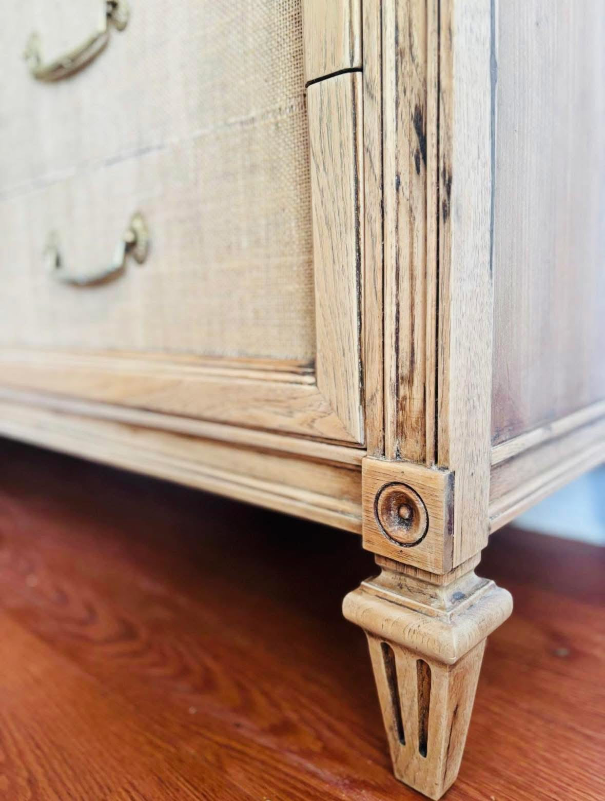 The Birchmeadow is a true showstopper — a grand 76-inch solid wood dresser, fully restored and reimagined to bring warmth and texture to your space. The entire piece has been sanded to the bare grain and bleached for a soft, natural finish that highlights the character of the wood. Six drawers are wrapped in hand-applied jute for a grounded, earthy feel, while three hidden drawers add a modern, balanced touch to the overall design.