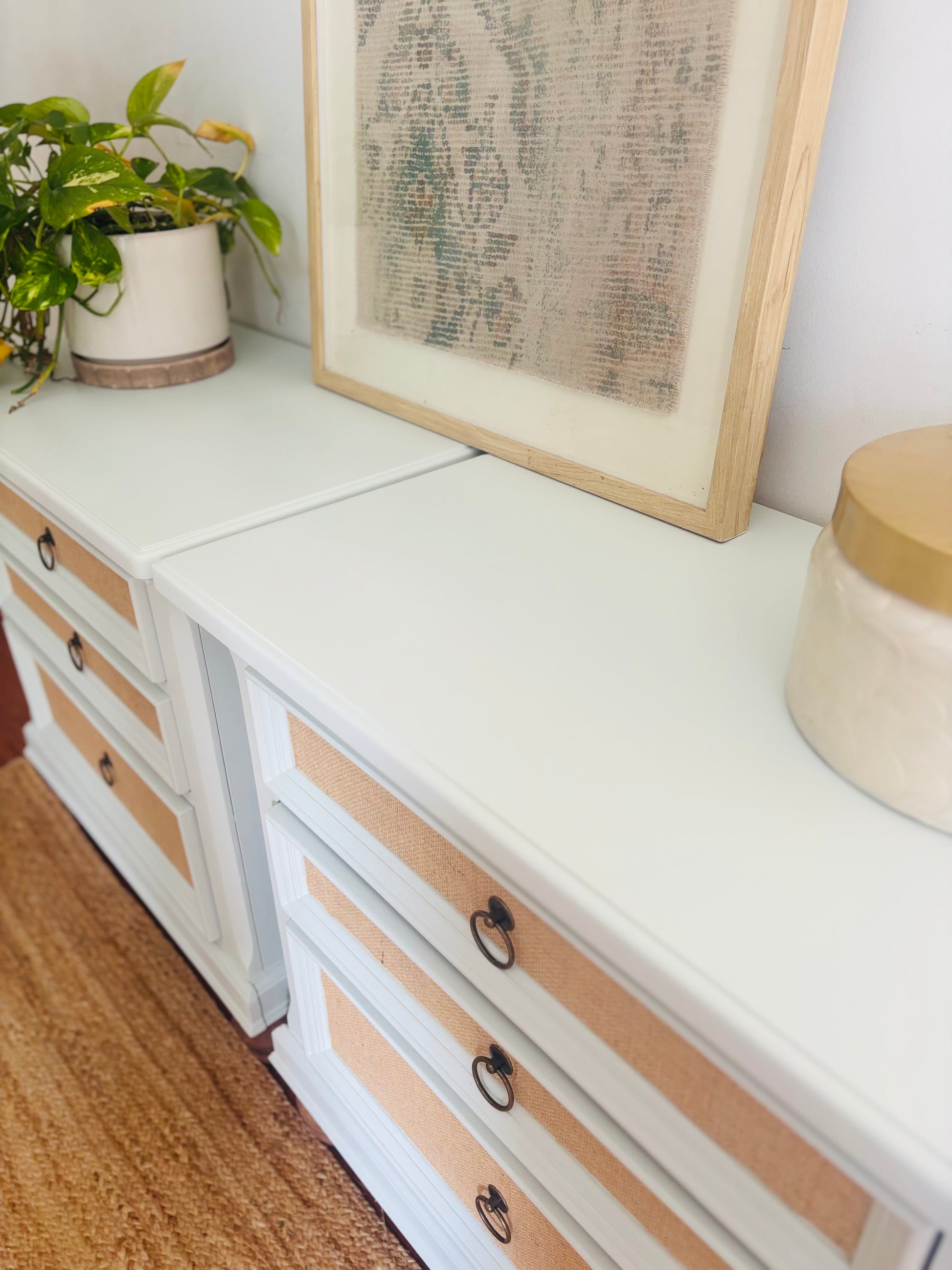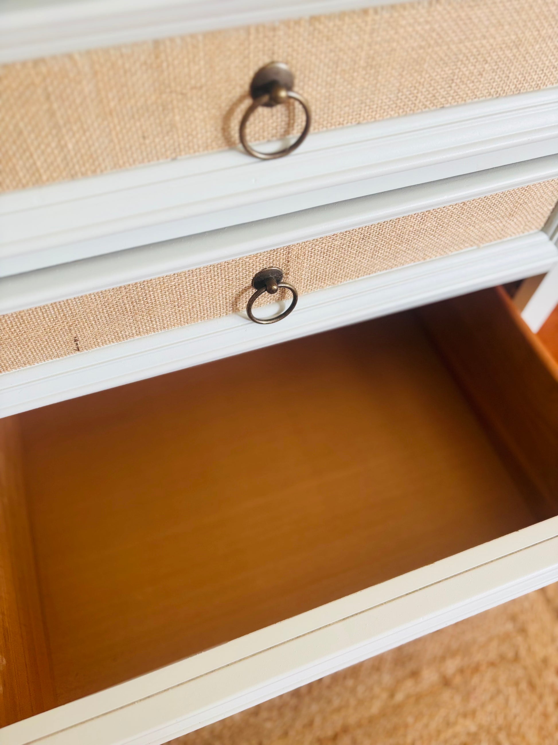 - Jute-wrapped drawer faces