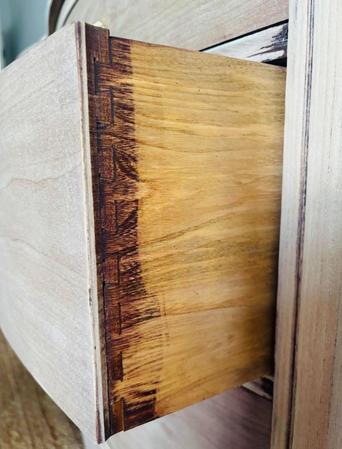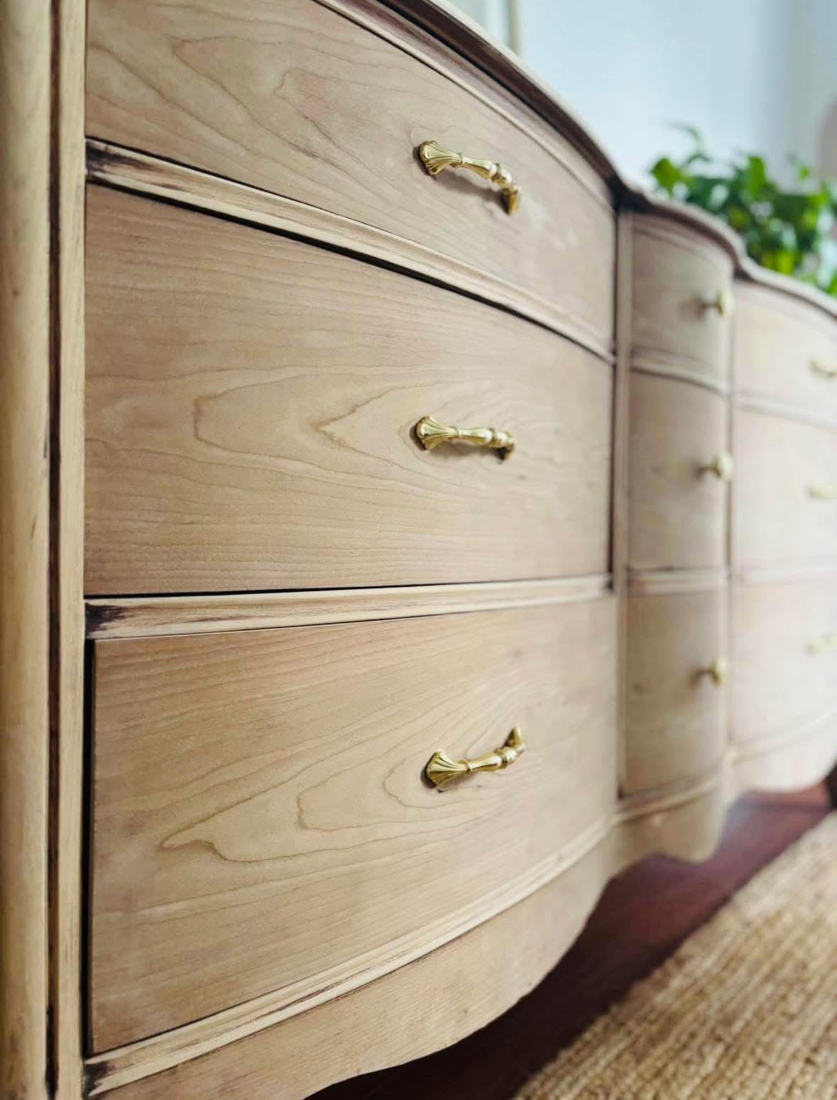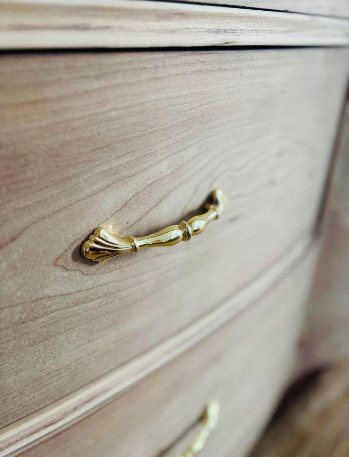 The Cedarmere is a beautifully refinished antique dresser, crafted from solid wood and carefully sanded and bleached to reveal its soft, natural grain. Vintage gold hardware adds a warm, elegant touch—perfectly complementing the dresser’s timeless lines and rich history.