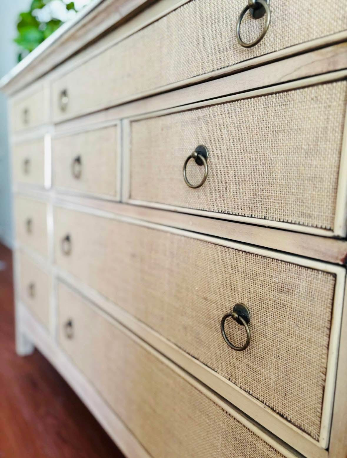 The Palegrove is a stunning celebration of natural beauty and functional design. This oversized solid wood dresser has been fully sanded down and bleached to reveal a soft, earthy grain — perfectly complemented by hand-applied jute on each drawer face for added warmth and texture.