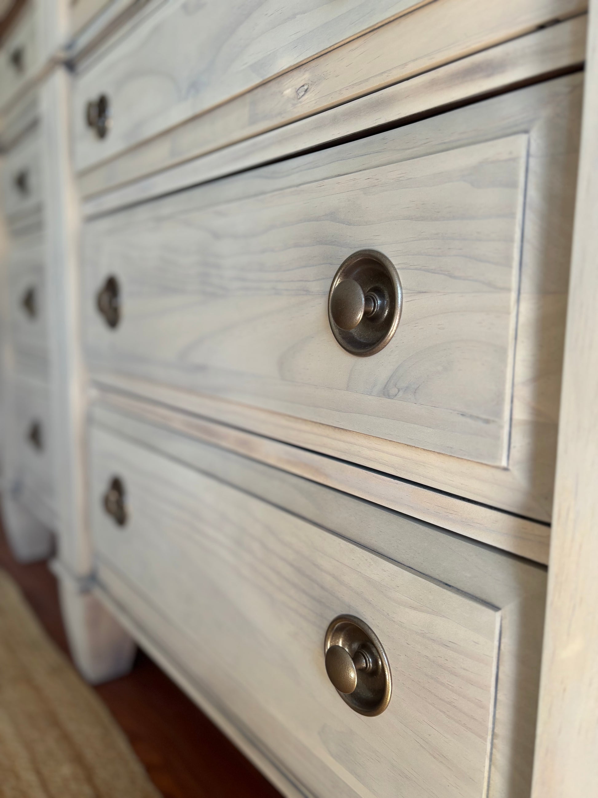 Crafted from solid wood throughout, the Ridgeoak was entirely stripped down and finished with a soft tan wash to intentionally highlight the natural wood grain. The result is a warm, organic finish with depth and movement—showcasing the craftsmanship and character of the wood itself.