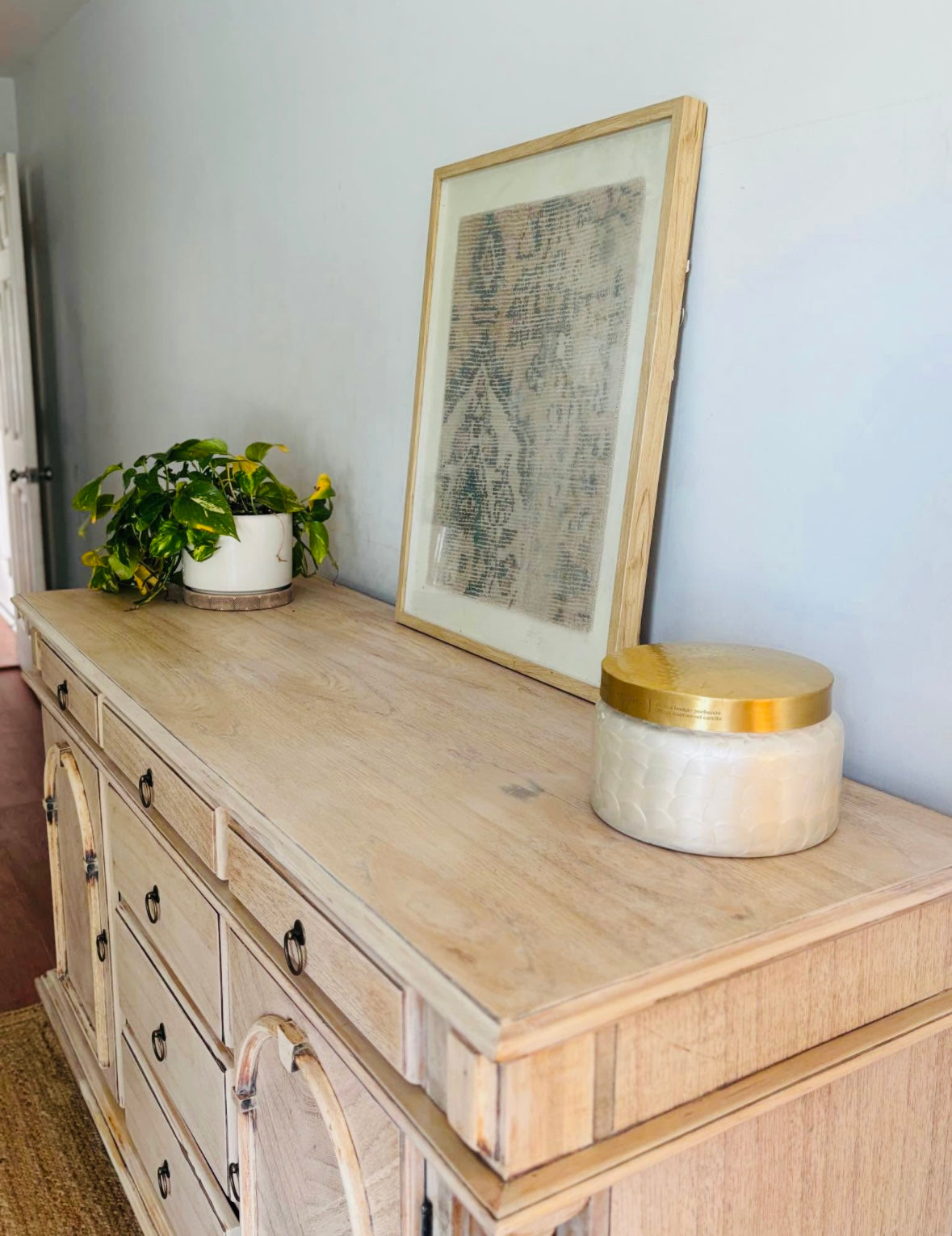 The wood has been carefully sanded to its raw grain, bleached to reveal its natural tone, and sealed with a durable topcoat for lasting protection. Arched cabinet doors and crisp brass ring pulls add warmth and refined character to its substantial frame.