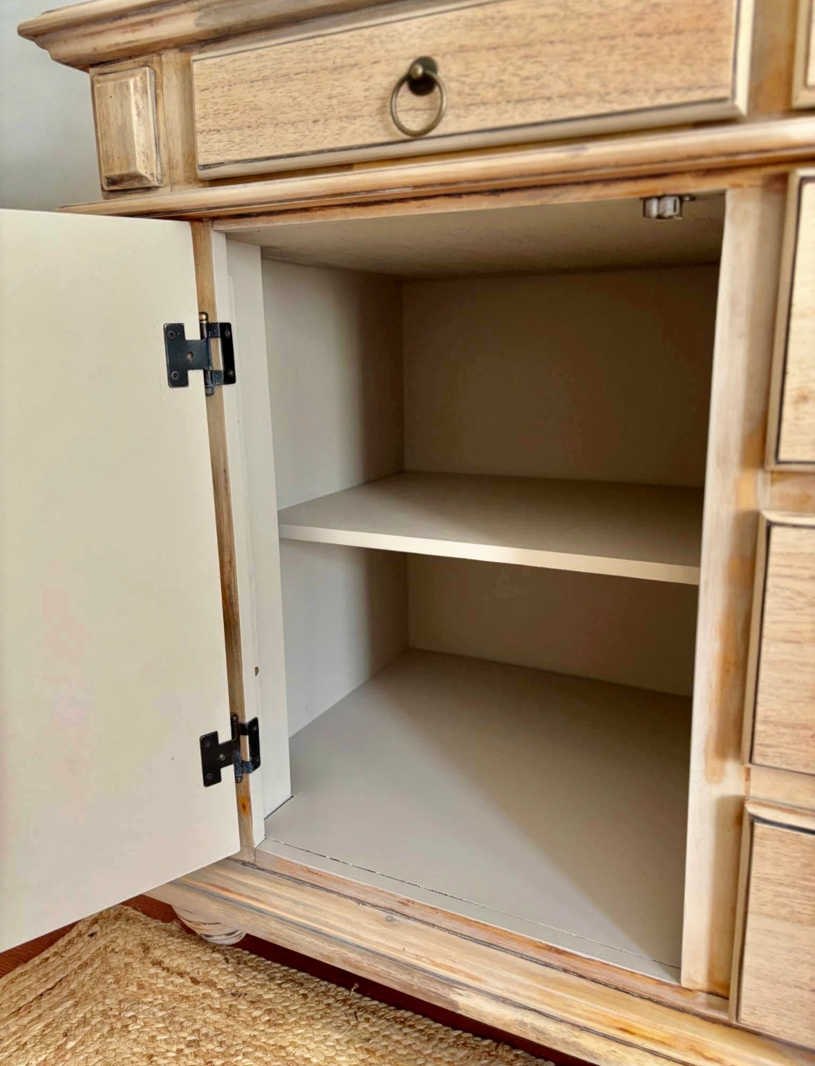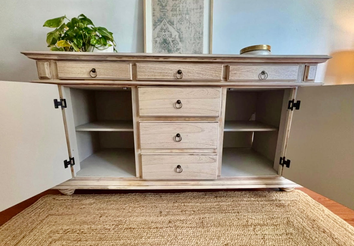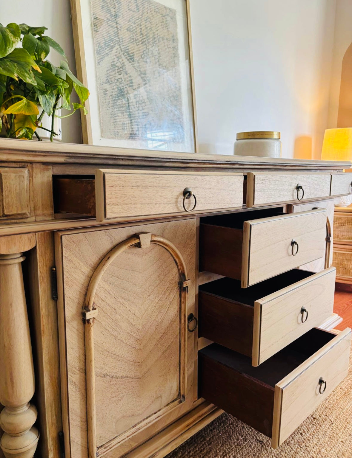 The Sequoia Ridge Buffet is a beautifully restored solid wood piece that combines elegant craftsmanship with practical storage. Featuring six deep drawers and two arched cabinet doors, this buffet offers both beauty and utility for any space.