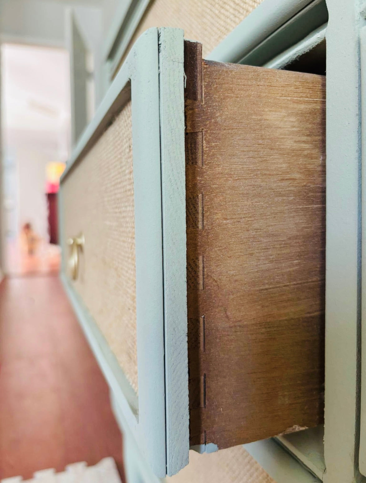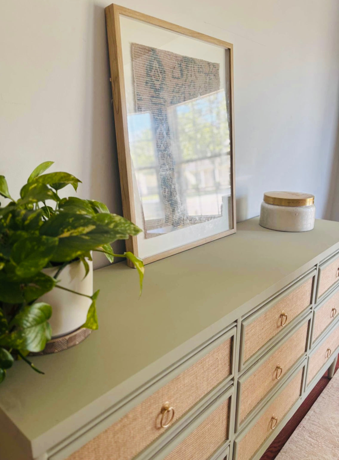 The Sunsetsage is a freshly refinished 9-drawer dresser painted in a soft sage green and detailed with natural jute-wrapped drawer faces. Gold ring pulls complete the look with a refined finish, creating a perfect balance of warmth and sophistication.
